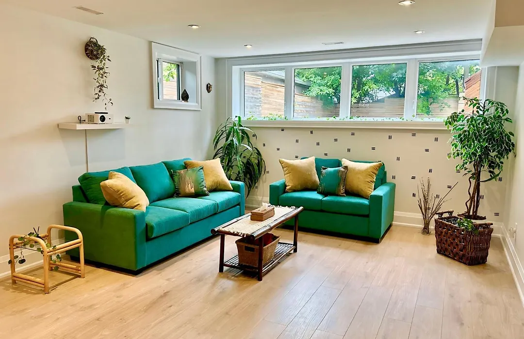 Boho-Chic Spacious Basement Apartment features a flat-screen TV with satellite channels, comforts like an iron with ironing board and climate control, as well as such safety facilities as smoke detectors and an electronic key card. Boho-Chic Spacious Basement Apartment apartment comprises 1 bathroom that offer a bath and a shower.